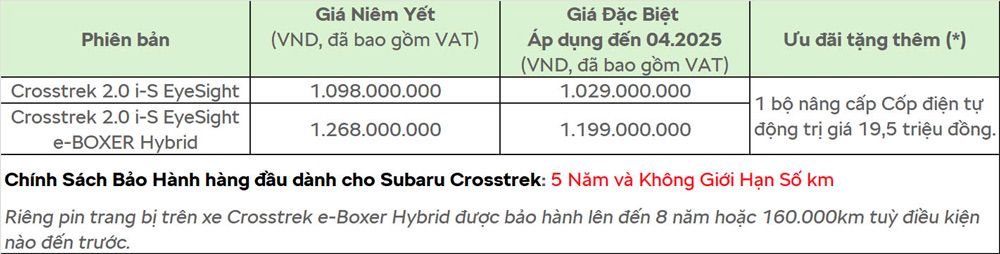 Tuy nhiên, điểm mạnh của Crosstrek là nhập khẩu chất lượng Nhật Bản cùng các tính năng an toàn ADAS ưu việt nổi bật là Eyesight 4.0. Mức giá xe Subaru Crosstrek và các chương trình khuyến mãi trong tháng 04/2025 như sau :